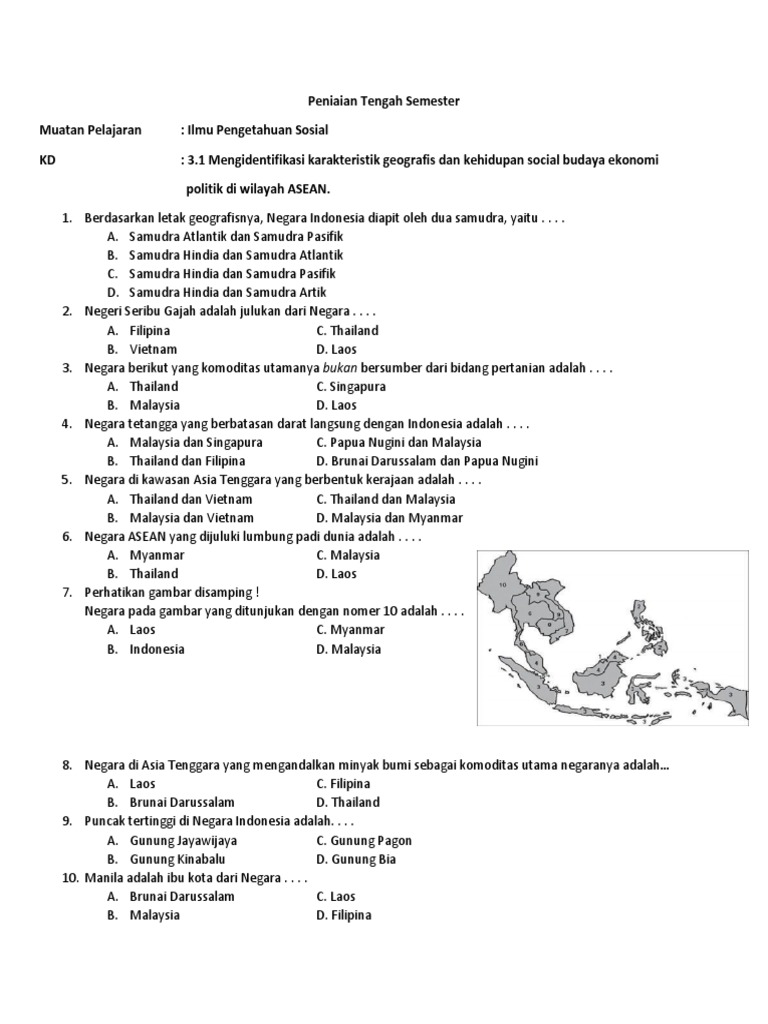 Peniaian Tengah Semester Muatan Pelajaran Ilmu Pengetahuan Sosial Kd 3 1 Mengidentifikasi Karakteristik Geografis Dan Kehidupan Social Budaya Ekonomi Politik Di Wilayah Asean