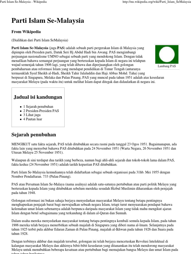 Parti Islam Se Malaysia Wikipedia Khazanahnasional A Parti Islam Se Malaysia Juga Pas Adalah Sebuah Parti Pergerakan Islam Di Malaysia Yang Menghapuskan Penjajah Barat Pdf Document