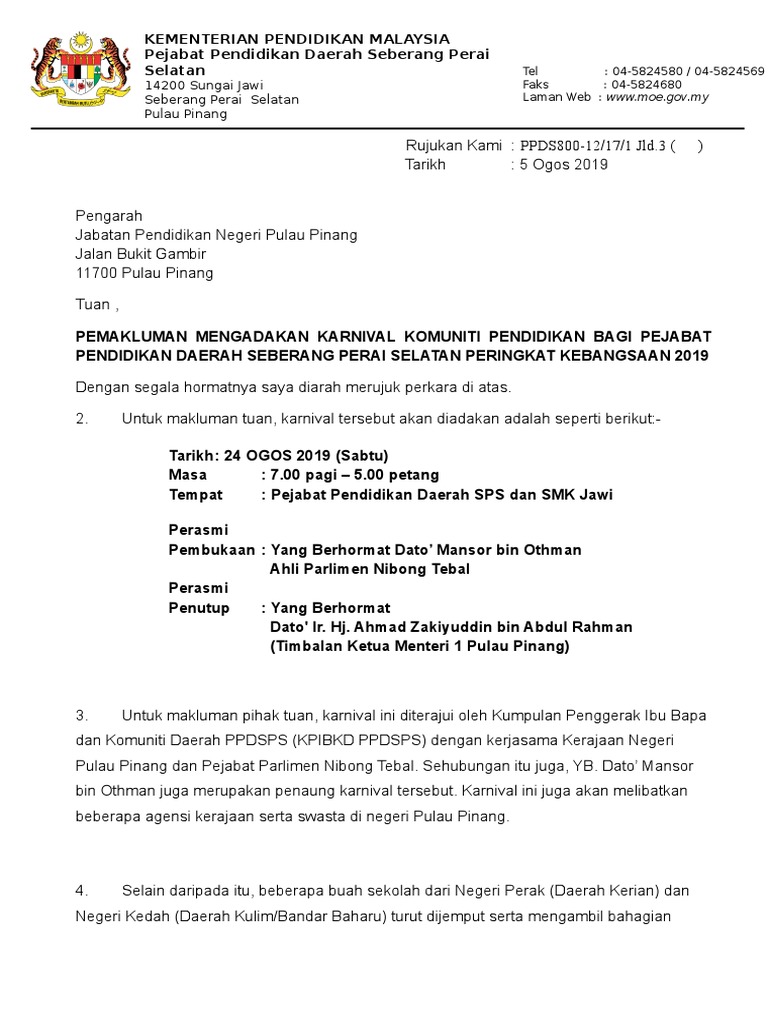 Pemakluman Mengadakan Karnival Komuniti Pendidikan Bagi Pejabat Pendidikan Daerah Seberang Perai Selatan 2019