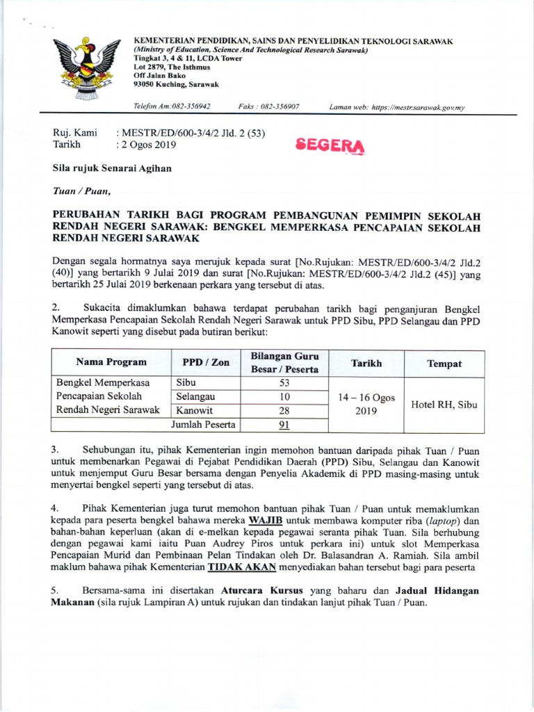 Perubahan Tarikh Bengkel Di Rh Hotel Sibu Ppd
