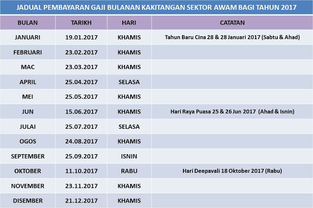 Jadual Tarikh Pembayaran Gaji Tahun 2018 Penjawat Awam