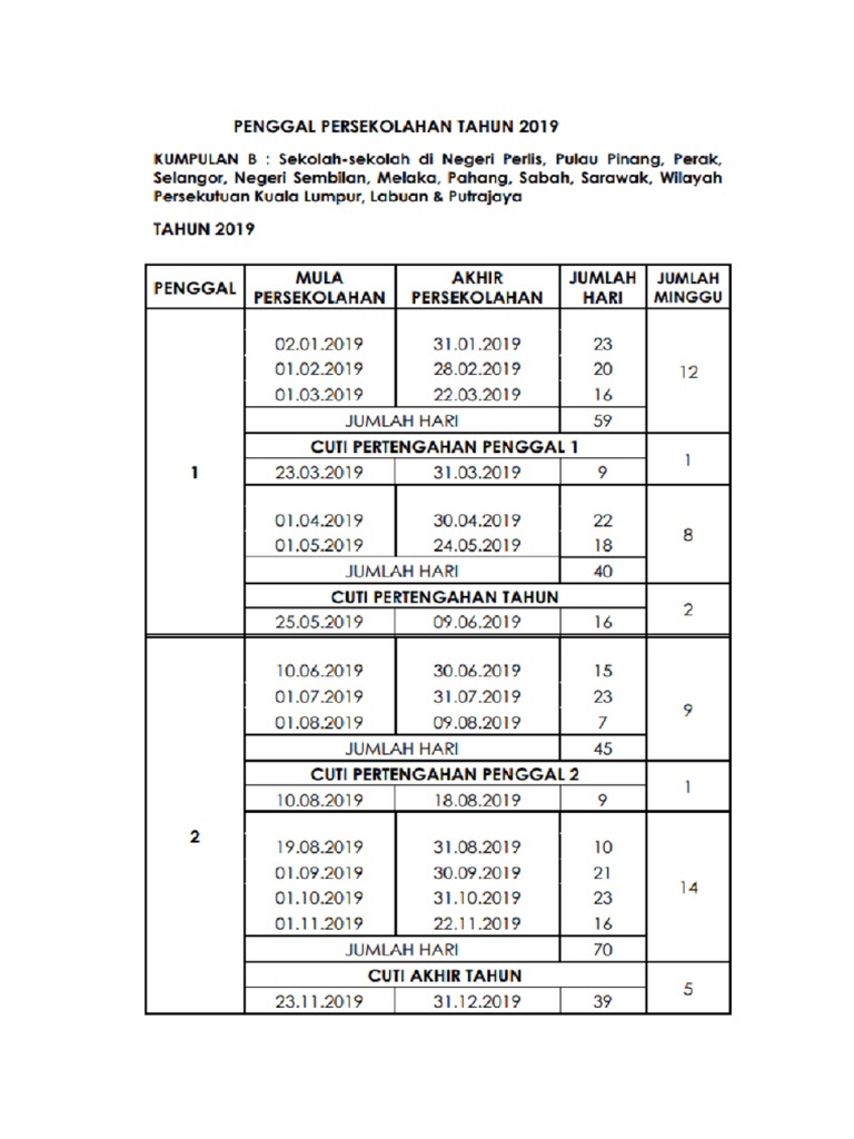 Takwim Cuti Sekolah 2019 Kumpulan B Kronis J