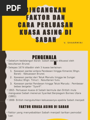 6th 9th grade. British telah menduduki singapura 1879 melaka 1824 dan siam mencerobohi kedaulatan negeri negeri melayu utara iaitu kedah perlis kelantan dan terengganu. Kawasan pantai antara pandasan hingga kimanis terletak di bawah kekuasaan brunei. Jelaskan cara perluasan kuasa asing di negeri sabah.