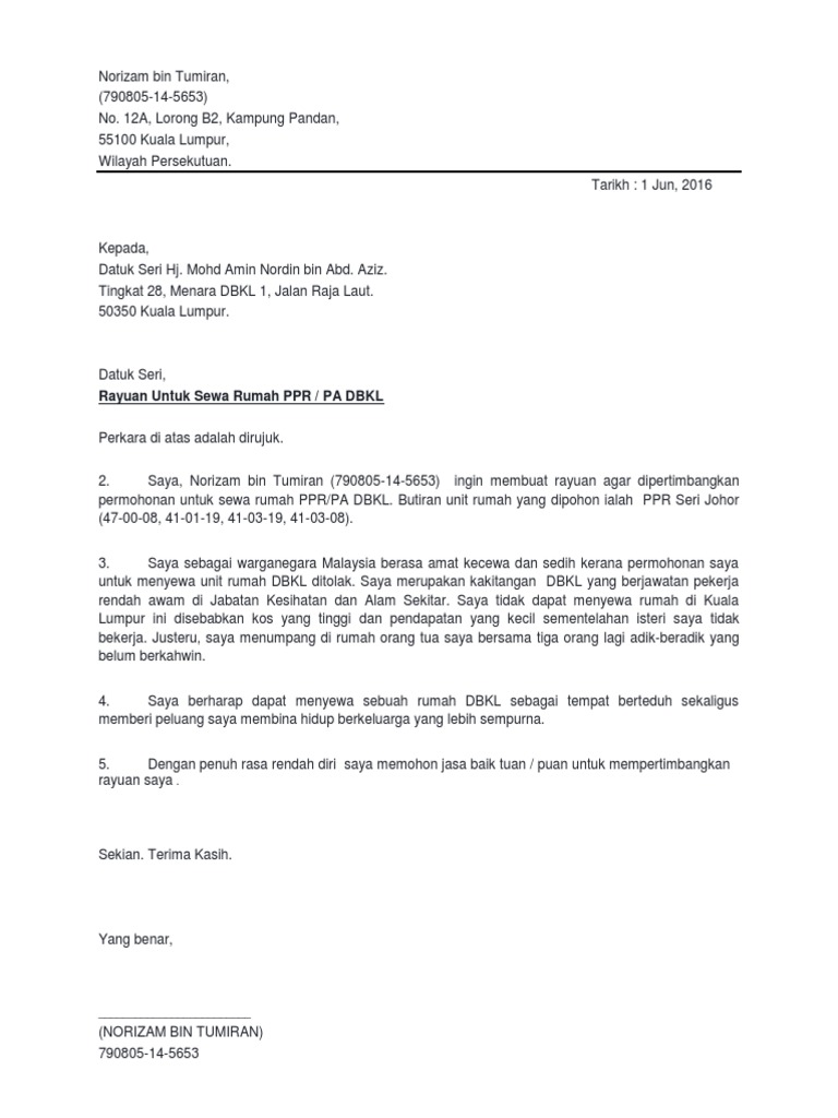 Surat Rasmi Memohon Ruman Kos Rendah