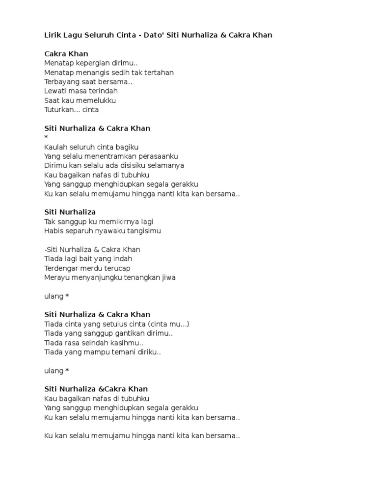 Lirik Lagu Seluruh Cinta Cakra Khan Feat Siti Nurhaliza Lirik Lagu Favorit