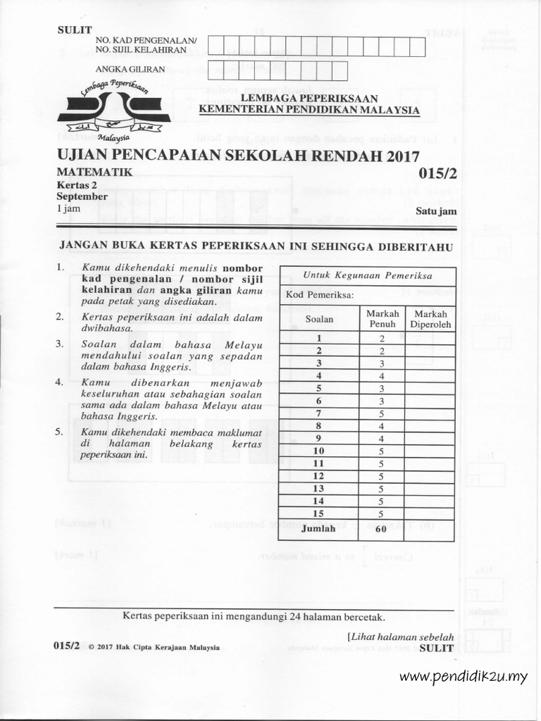 Ujian Percubaan 2017 Matematik 015 2 Sistem Nbsp Kertas Soalan Ini Mengandungi 15 Soalan 3 Lengkapkan Ayat Matematik Berdasarkan Rajah Jumlah Murid Tahun 4 5 Dan 6 Pdf Document